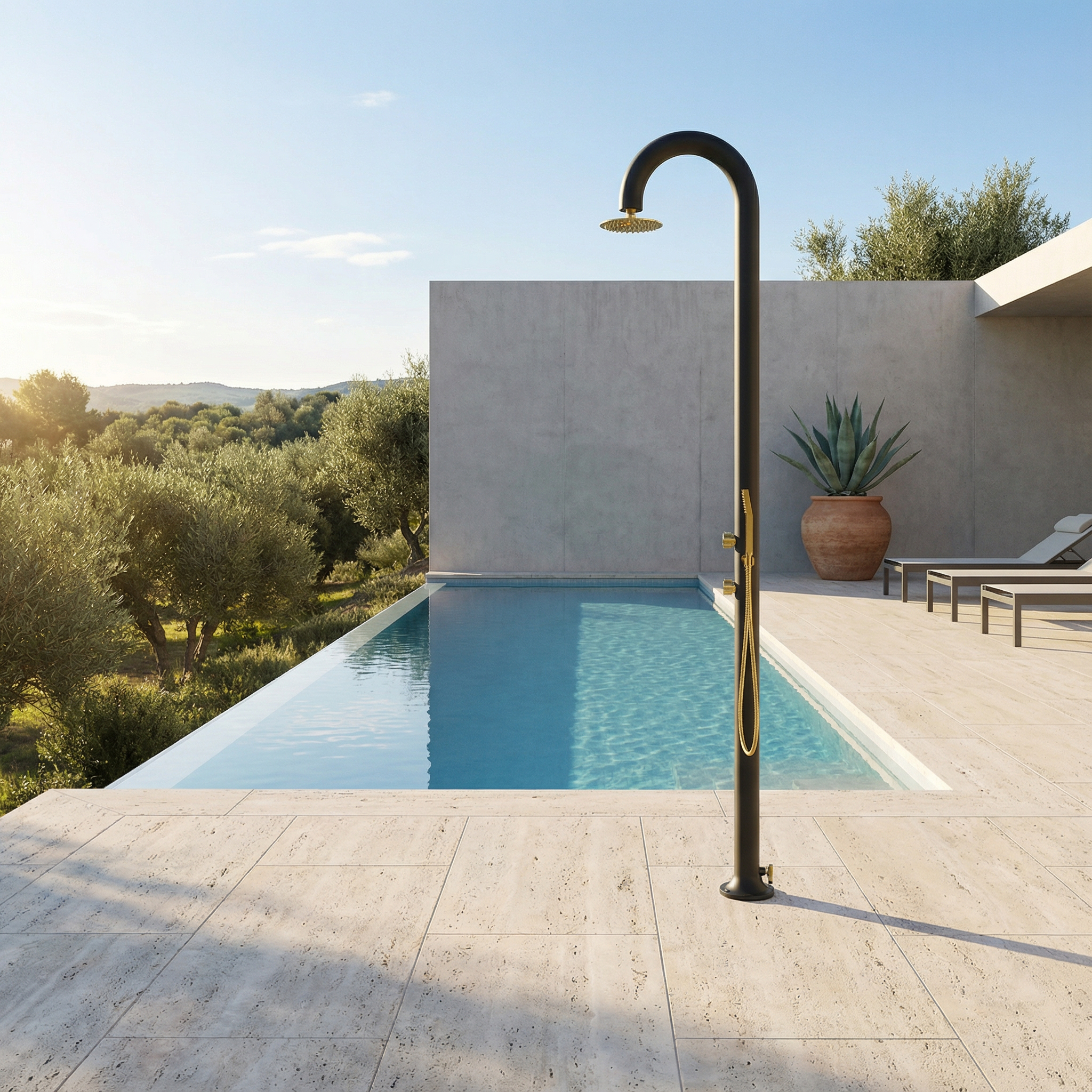 Qu’elle soit installée dans la salle de bain à la maison, dans un jardin ou dans un cadre professionnel tel que les hôtels et les stations balnéaires, la douche classique en aluminium noir et or avec douchette à main de SINED est synonyme de qualité, de design et d’innovation, prête à transformer n’importe quel espace en une oasis de confort et de style.