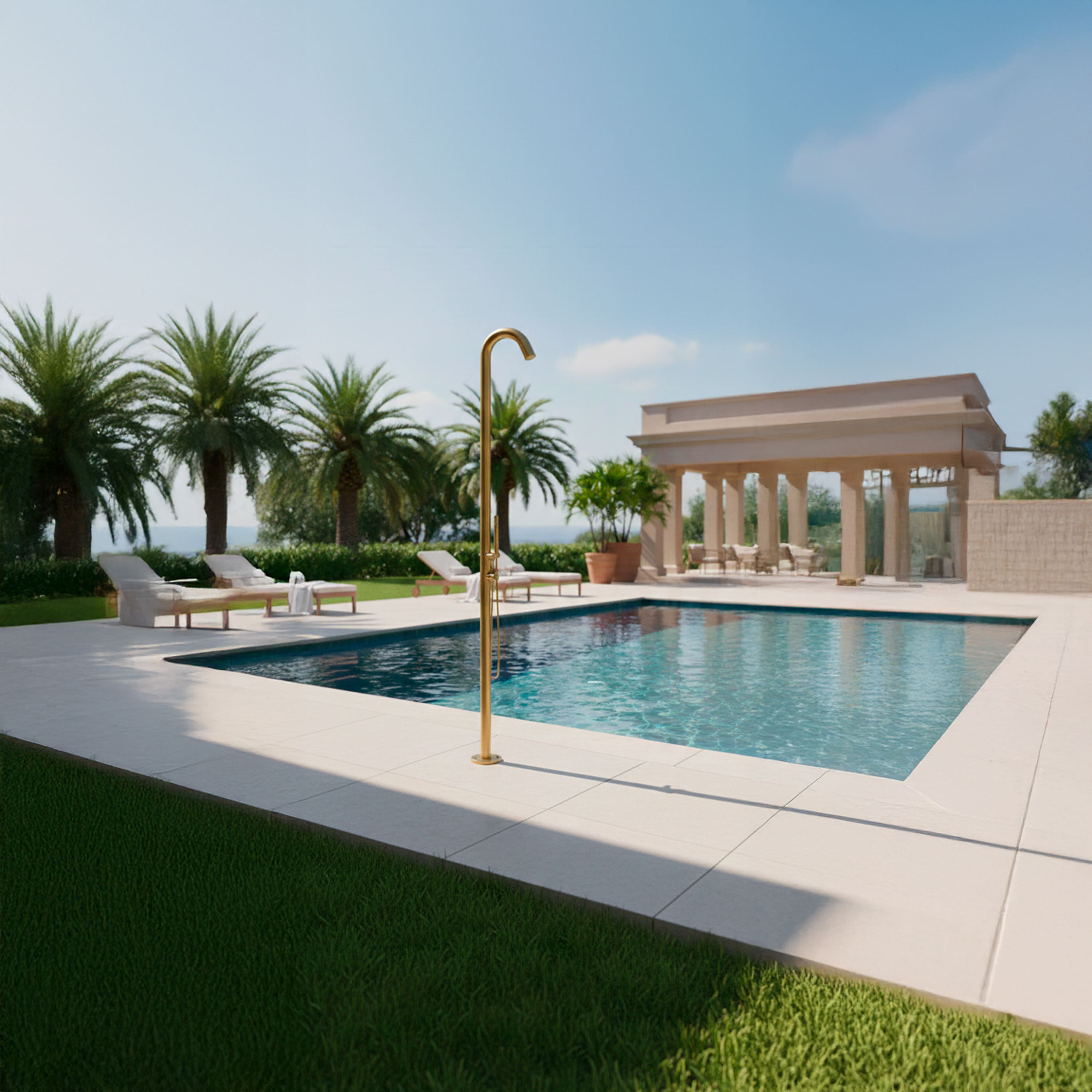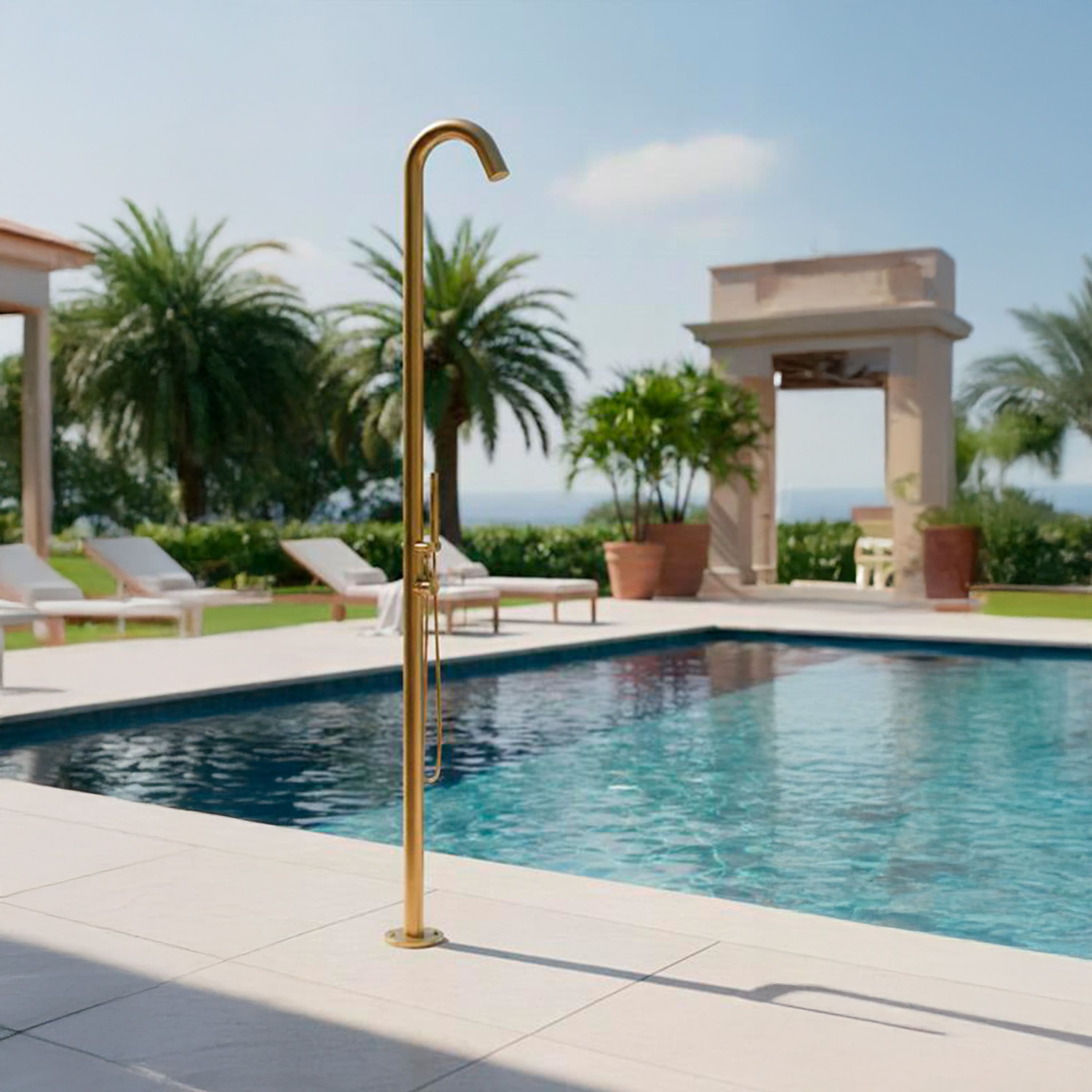 découvrez la douche de jardin sined alghero en acier, une véritable alliance entre élégance et performance. grâce à sa finition dorée satinée, elle apporte une touche de raffinement unique à votre espace extérieur ou intérieur. conçue avec des matériaux de haute qualité, notamment de l’acier inoxydable aisi 316l pour la douchette, le mitigeur et les accessoires, cette douche est pensée pour résister aux agressions du temps et assurer une durabilité exceptionnelle.